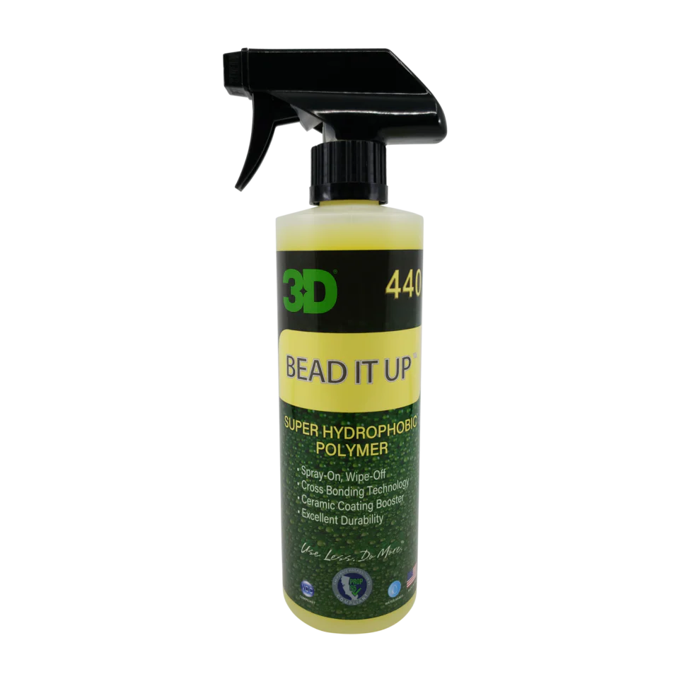 Bead It Up es el nuevo sellador polimérico súper hidrófobo de 3D Products ¡Este producto de limpieza fácil de usar y en spray introduce un recubrimiento de tensioactivos a base de polímeros súper elegantes que harán que su pintura, vidrio, molduras y ruedas se sientan más resbaladizas que el teflón! Al utilizar la tecnología de unión cruzada, Bead It Up de 3D crea una capa de sacrificio suave, duradera para las superficies de sus vehículos, por lo que no tendrá que preocuparse por los excrementos de pájaros, las manchas de agua y las salpicaduras de insectos incrustados directamente en su capa transparente. Bead It Up también se puede usar como revestimiento cerámico o topper de cera para aumentar la protección y la resbaladiza de sus vehículos.