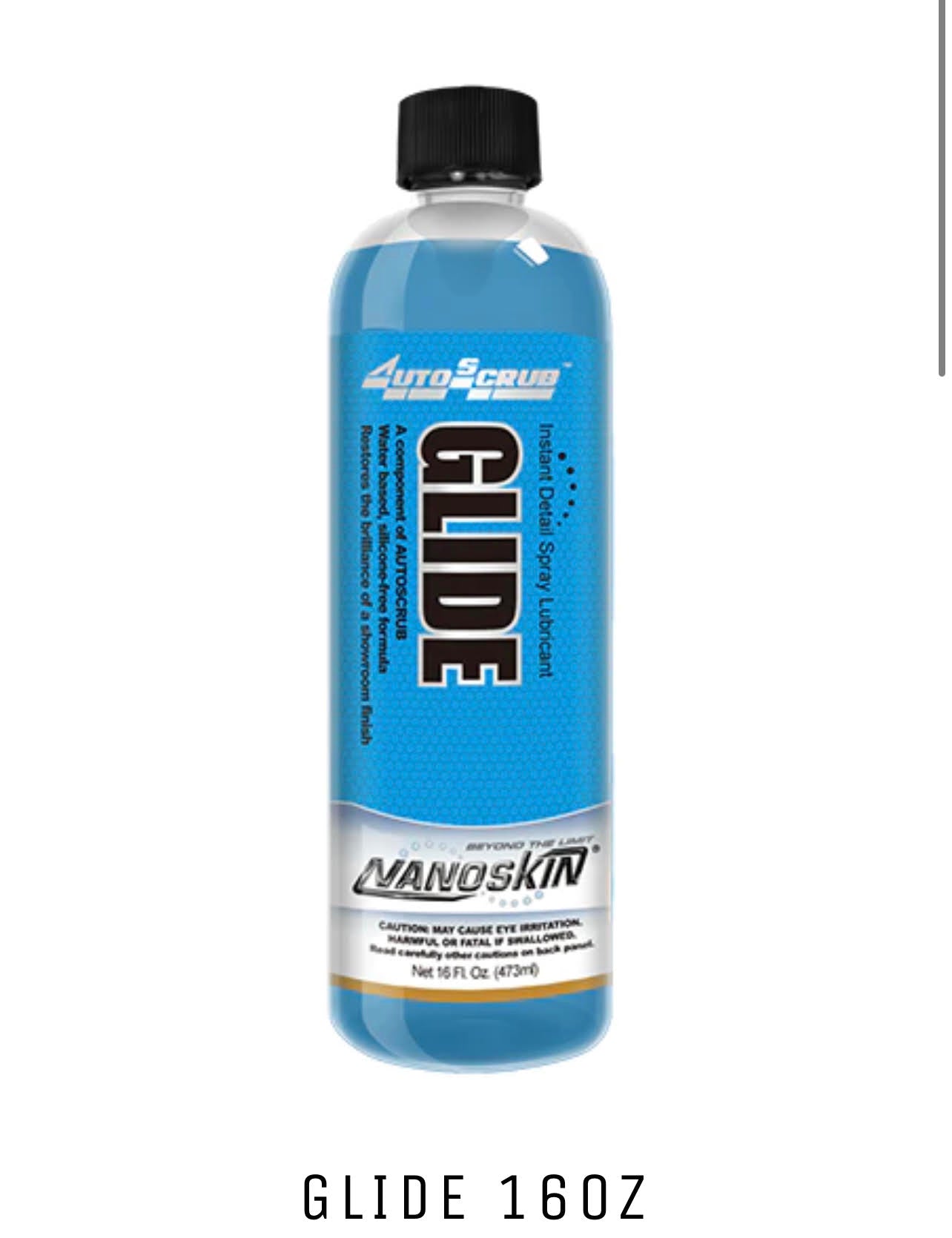 Como componente de AUTOSCRUB, NANOSKIN GLIDE lubrica muy bien la pintura mientras desliza el AUTOSCRUB hacia adelante y hacia atrás. GLIDE elimina contaminantes menores, polvo, huellas dactilares, insectos y más, restaurando el brillo del acabado de una sala de exposición. También se puede utilizar sobre vidrio, cromo y plástico. El spray se seca de forma cristalina sobre cualquier superficie y realza los reflejos en materiales brillantes, como ruedas y molduras cromadas. Es muy fácil y puedes detallar un auto de tamaño completo en menos de 10 minutos.