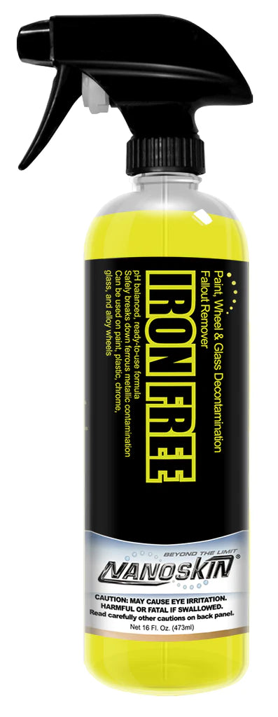 NANOSKIN  IRON FREE, es un limpiador de pintura y llantas/removedor de lluvia radiactiva sin ácidos y con PH equilibrado. SIN HIERRO descompone de forma segura la contaminación metálica ferrosa causada por los frenos de automóviles, los viajes en tren y la construcción. Descontamina la pintura delicada, el plástico, el cromo, el vidrio y las llantas de aleación. IRON FREE se rocía sobre verde fluorescente y se vuelve rojizo al reaccionar con las partículas de hierro, lo que facilita su eliminación. La fórmula espesa y de alta espuma SIN HIERRO se adhiere a las superficies verticales. Perfectamente seguro para usar en todo tipo de ruedas cuando no se usa bajo el sol directo o en una rueda caliente.