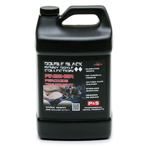El tratamiento de peróxido de acabado es el paso n.° 3 en el sistema de limpieza de interiores Double Black. Finisher completa el sistema agregando un ataque final a las moléculas que causan olores y manchas orgánicas. Finisher descompone los productos químicos que causan olores, elimina cualquier mancha orgánica residual y esteriliza ligeramente la superficie. Finisher ayuda a reducir las manchas de agua, los olores a moho y hongos, así como a la eliminación final de manchas. El finalizador se descompone en oxígeno y agua, sin dejar residuos químicos que requieran una mayor eliminación.